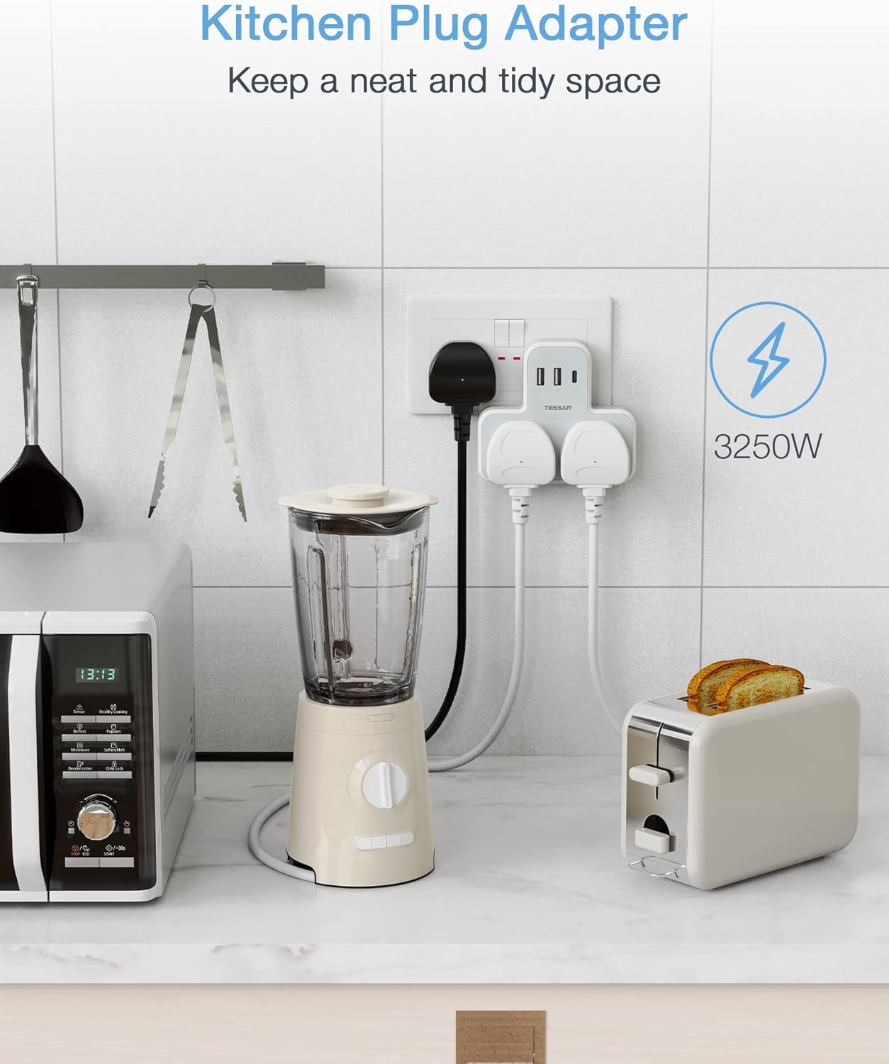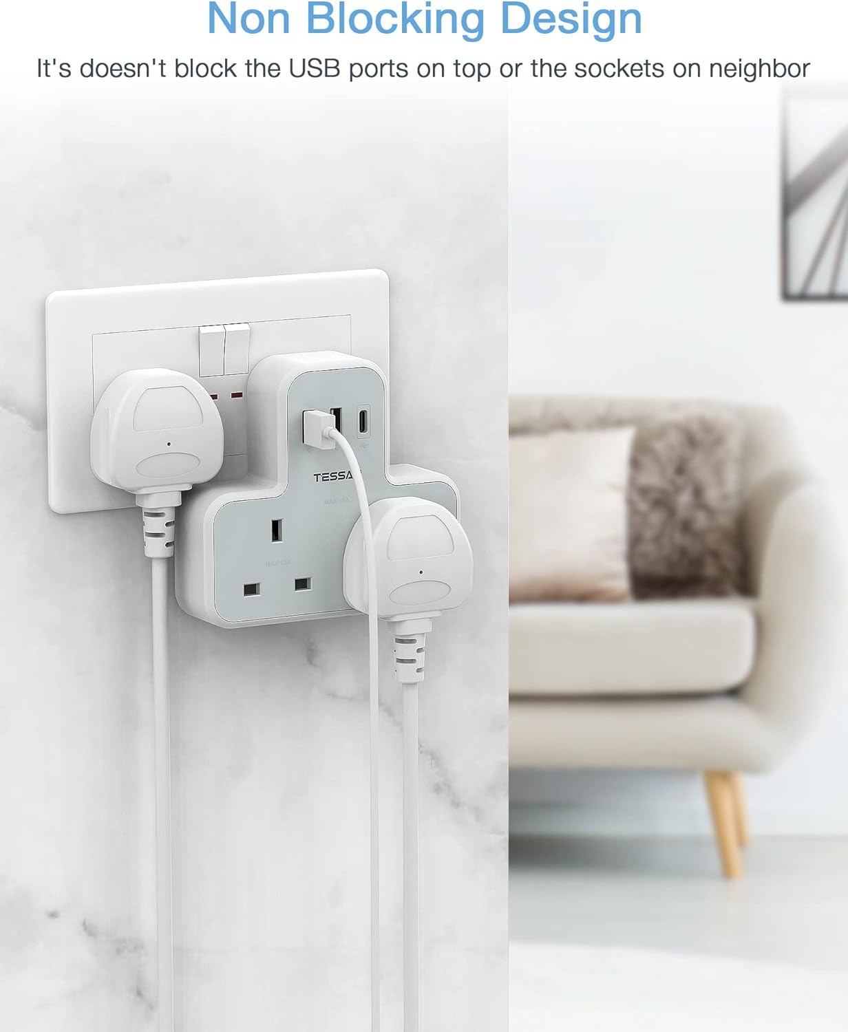 Tessan 2-Gang plug Through UK Charger 2 USB A USB C 13A TS-221-C